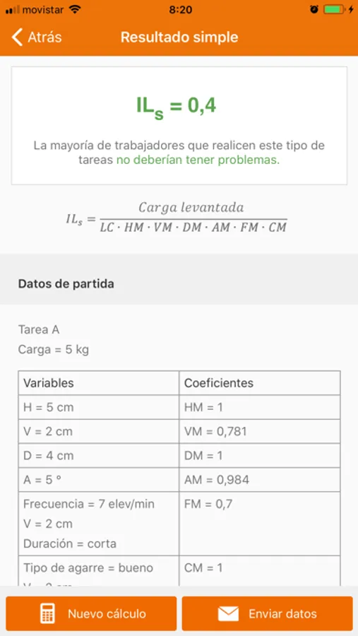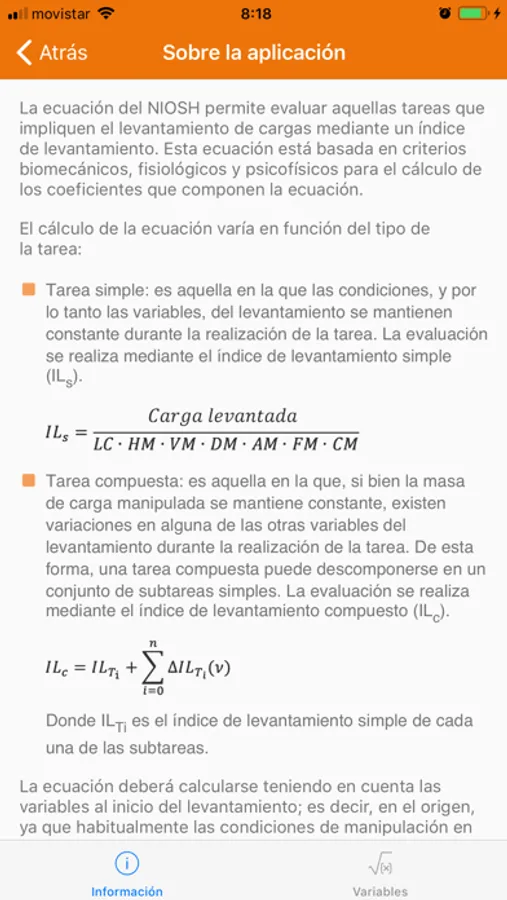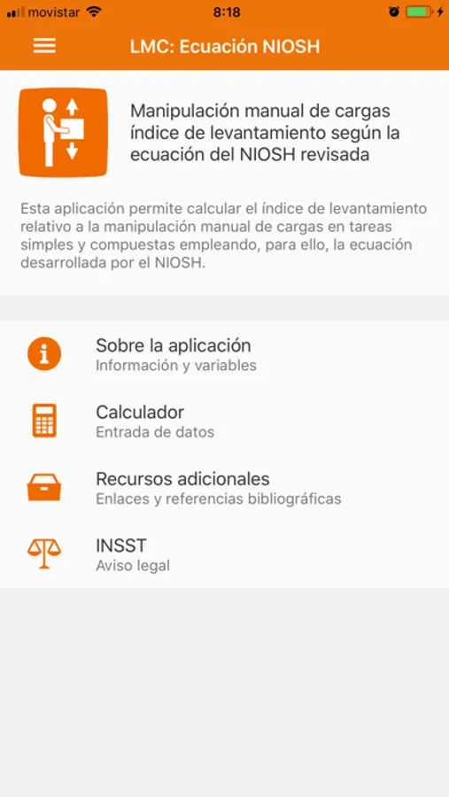 Esta aplicación permite calcular el índice de riesgo asociado a las tareas de levantamiento de cargas, tanto simples como compuestas, en base a la ecuación desarrollada por el NIOSH tal y como está recogido en la Nota Técnica de Prevención 477.