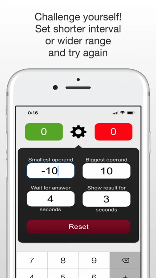 You can adjust how much time you have for each calculation and for how long you see the correct result before the next example appears.