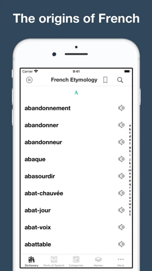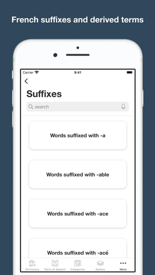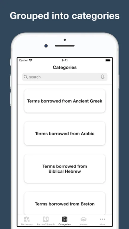 - Over 34300 entries including words, names, prefixes, suffixes, roots.