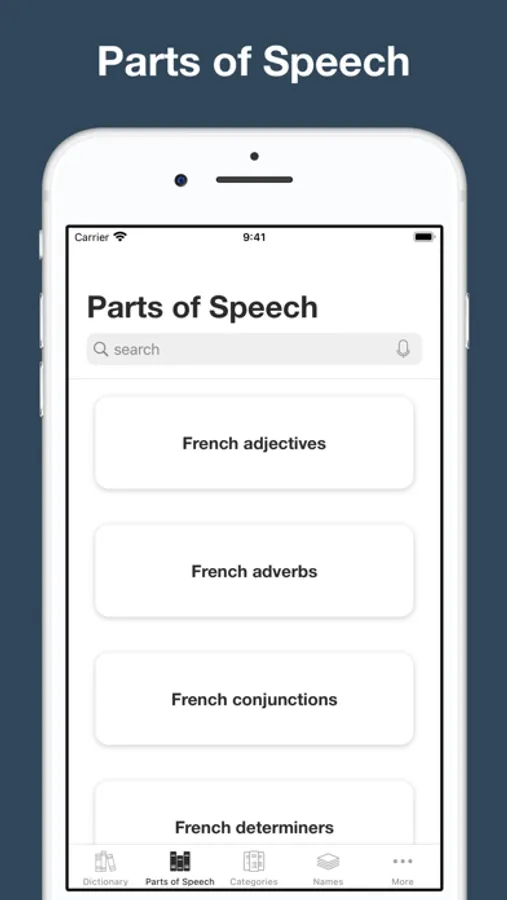 - French adjectives, French adverbs, French nouns, French verbs, French pronouns etc.