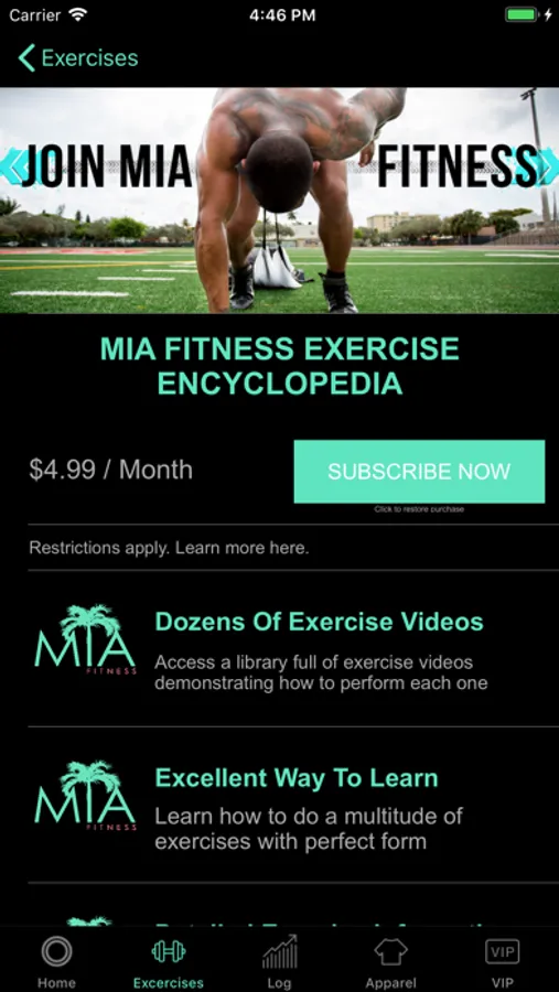 Get access to the MIA FITNESS Exercise Encyclopedia that allows you to receive access to a huge selection of exclusive exercise videos and exercise information updated monthly. Pay directly with your Apple ID. The subscription renews every month for 1 year. Subscriptions may be managed by the user and auto-renewal may be turned off by going to the user's Account Settings after purchase. Account will be charged for renewal within 24-hours prior to the end of the current period, and identify the cost of the renewal.