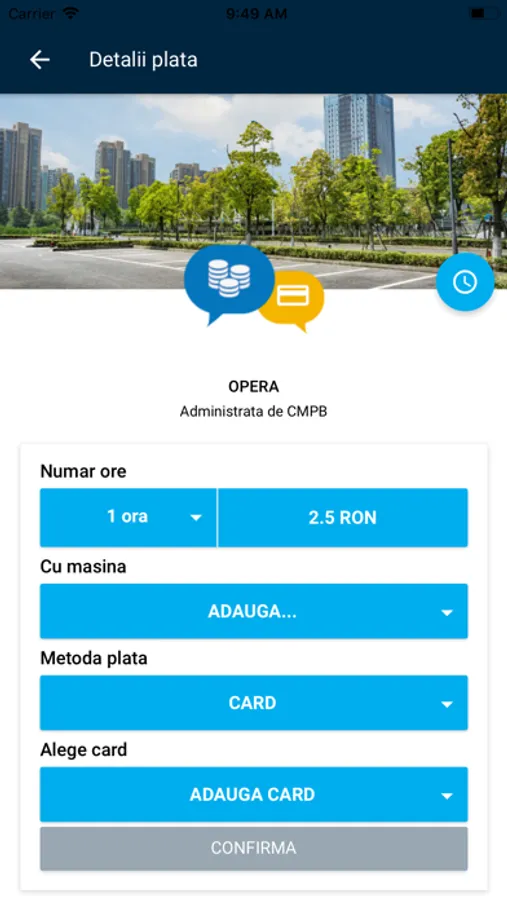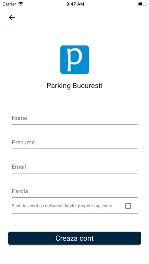 „Parking Bucuresti” este o aplicatie gratuita oferita de Compania Municipala Parking Bucuresti S.A. Autorii nu pot fi facuti responsabili de nicio consecinta ce decurge din folosirea aplicatiei, iar descarcarea ei constituie acordul pentru aceasta conditie de utilizare.