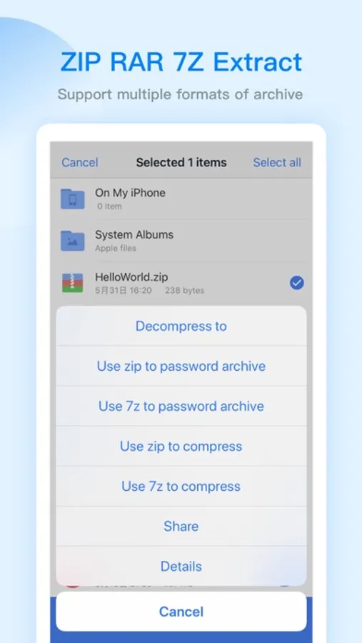 Support the compression and decompression of ZIP, RAR, 7Z format files