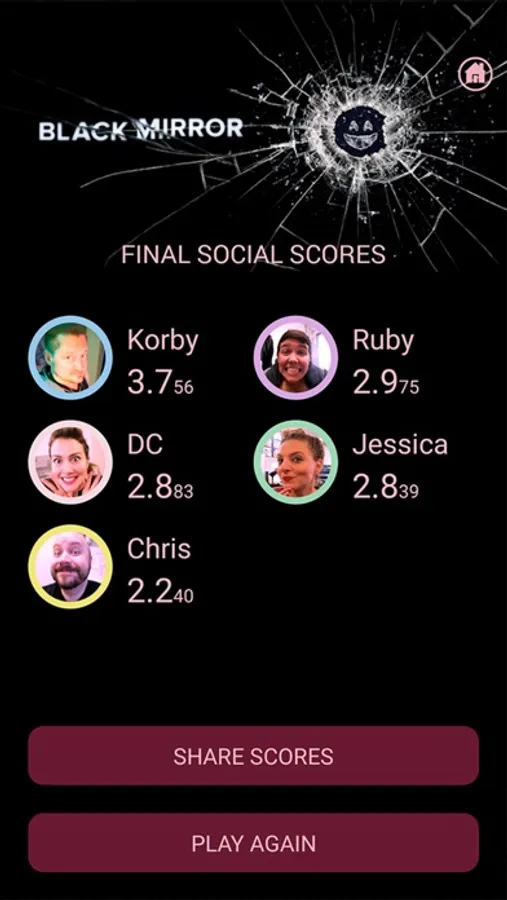 Players use the NOSEDIVE component app during the game to give each other various types of Experiences. They then rate those experiences within the app, and those rating either raise or lower the giver’s Social Score. The NOSEDIVE app also tracks each player’s Social Score throughout the game, which directly affects the scoring of the physical Lifestyle cards at the end of the game.