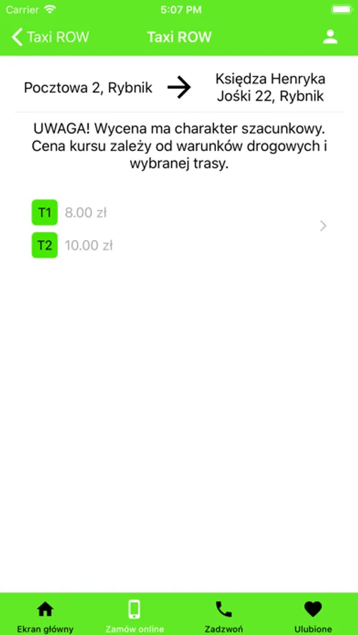- wyceny kursu (wystarczy podać skąd dokąd będziesz jechać, a aplikacja poda orientacyjną cenę),