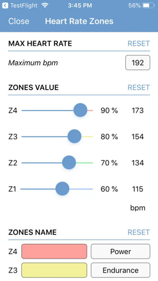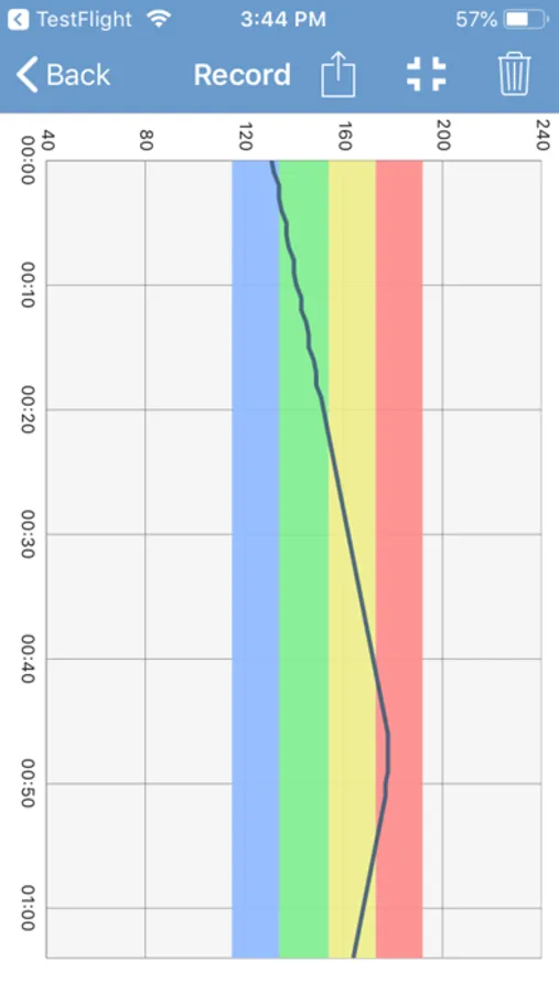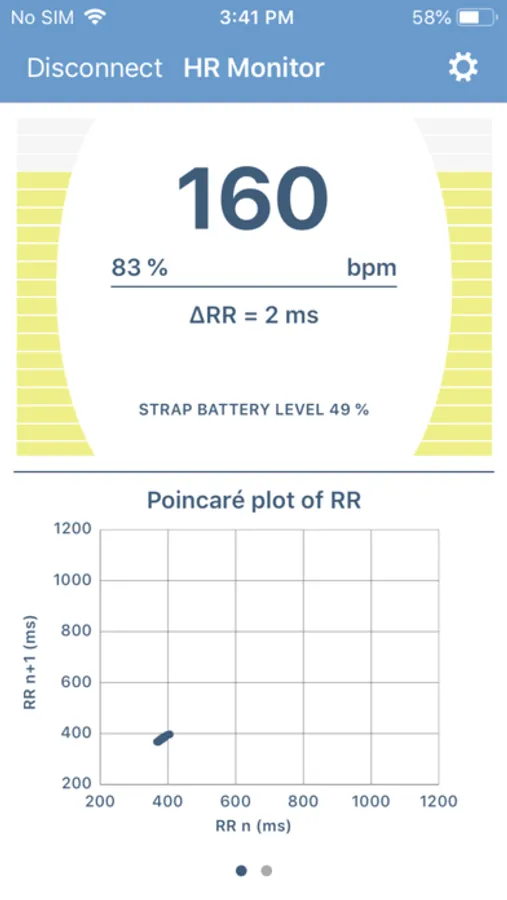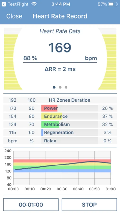 After the configuration of the individual settings and training zones, and a connection to the chest belt the heart rate is visualized as an absolute value of beats per minute and as a percentage of the stored maximum heart rate value of the user. Additionally, the deviation (variability) of the separate heart beats is displayed in milliseconds. The different training zones are individually colored and easily comprehensible.