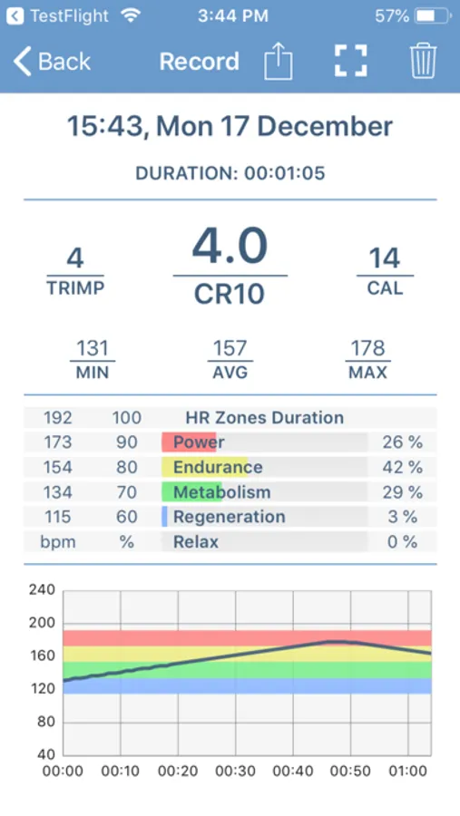 After starting the recording, the statistical values (MAX, AVG, and MIN) are updated continuously. Furthermore, the intensity of the training (TRIMP, CR10, kcal, a timeline of HR, zone duration) is displayed as an accumulated sum, as percentages, and as a graph.