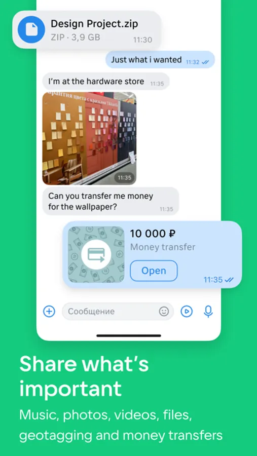 Sign in to your account and immediately see your friends in the messenger. You can also add contacts from your phone and write to anyone you’ve exchanged numbers with.
