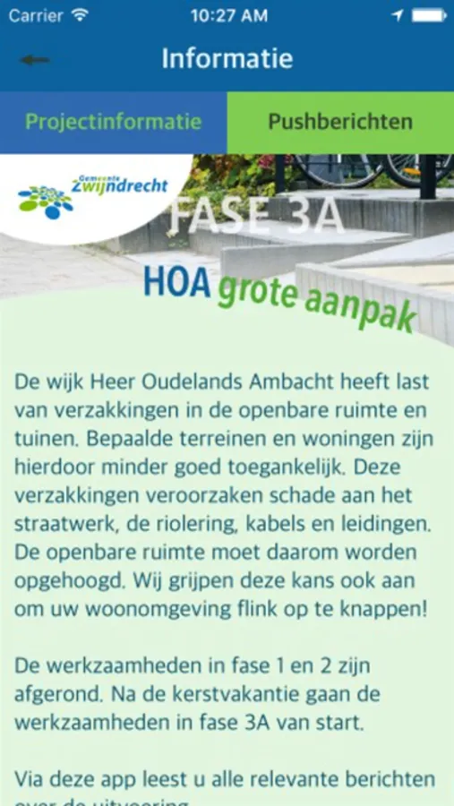 In deze app vindt u alle informatie over de werkzaamheden in Heer Oudelands Ambacht. Er worden updates geplaatst over de voortgang van de werkzaamheden, de laatste planning en u vindt relevante contactinformatie . Ook kunt u op deze app vragen, opmerkingen of klachten achterlaten die betrekking hebben op het project.