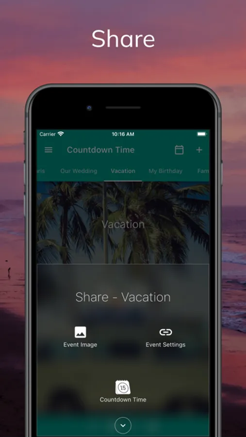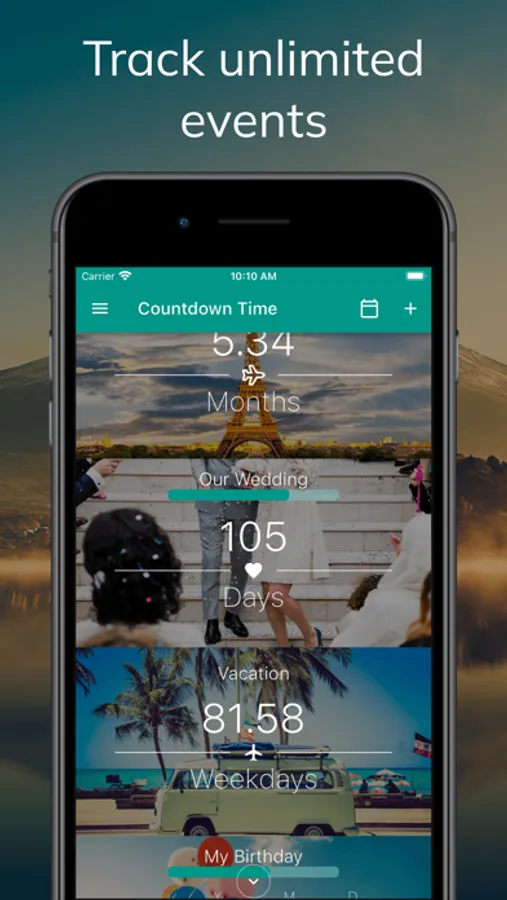 Have your most anticipated events right at your fingertips with Countdown Time. Events are tracked to the second in real-time with razor accuracy. Feel the excitement as the day draws closer and share it with friends and family. Pick from hundreds of beautiful backgrounds to truly bring your event to life and make the day uniquely yours.