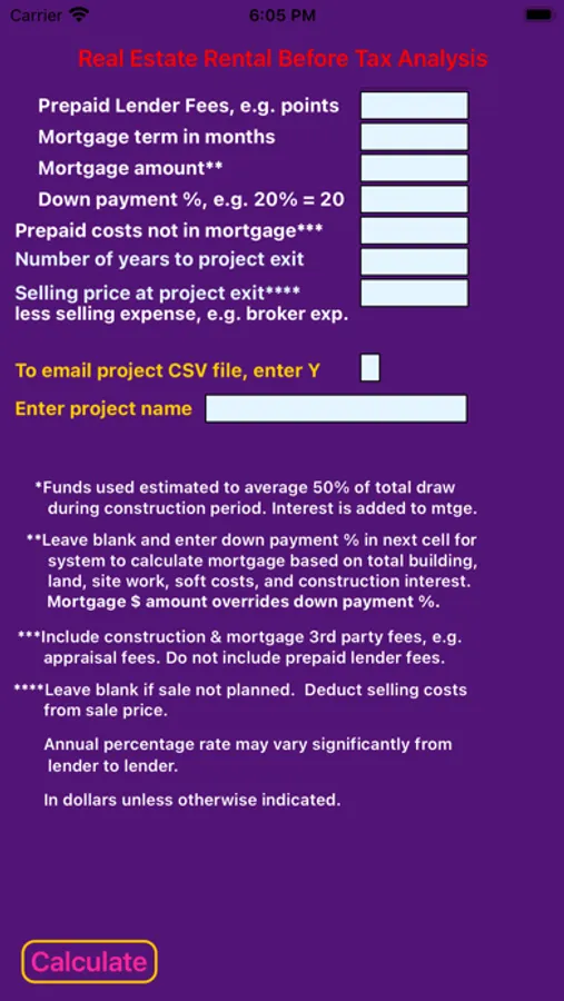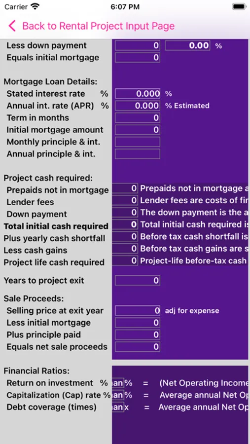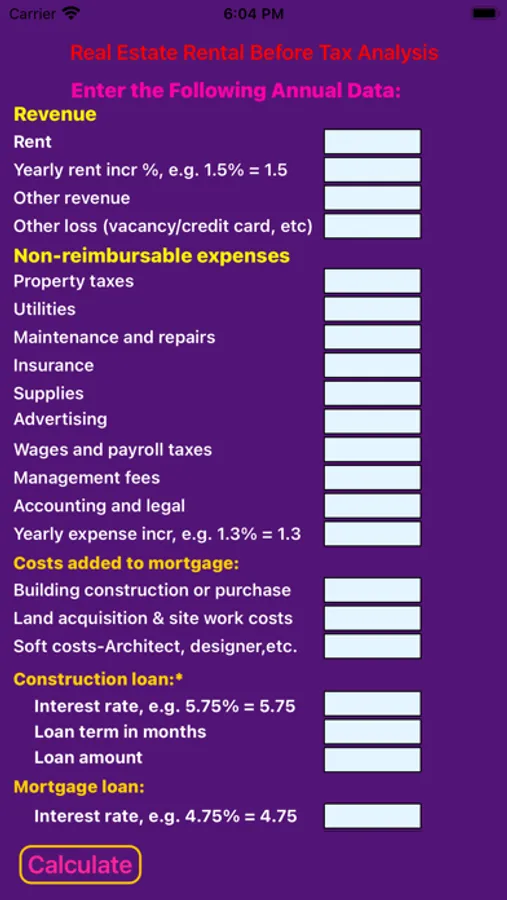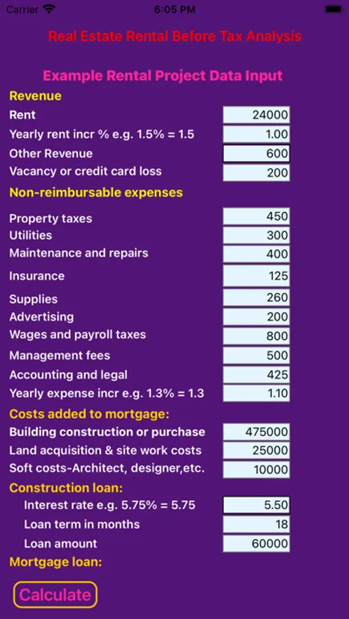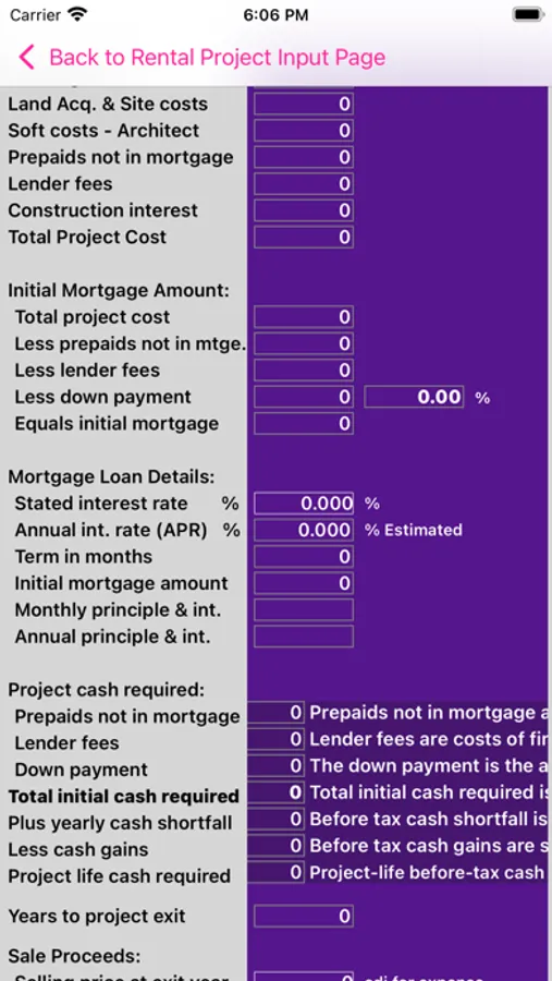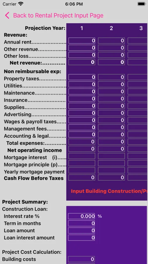Real Estate Rental Analysis is a quick and easy way to analyze the financial potential of a real estate project. The system provides up to 15 years of detailed key financial data including net operating income, construction loan interest, down payment amount, mortgage interest and principle, before tax cash flow, and net sale proceeds. In addition, key financial indicators, such as return on investment, capitalization rate, debt coverage ratio and APR are provided to assist with the decision process. The components of the project, such as expected annual rent and expenses; land and building construction costs; or building purchase price, are entered in the app. A yearly rent increase and separate expense increase percentage is entered to adjust future years results for potential inflation. The exit year is then entered to obtain yearly and total results.