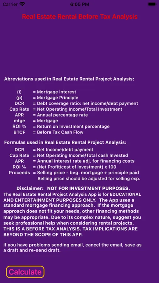 Due to the amount of data provided, the Real Estate Rental Analysis app has been designed for use by iPhone 6 and newer iPhones.