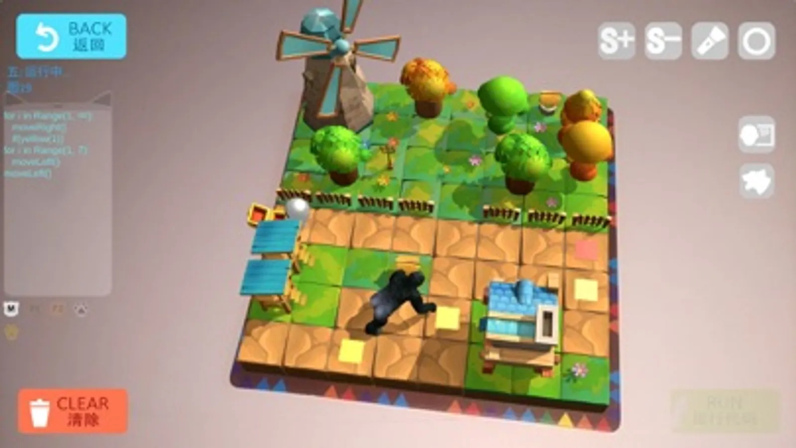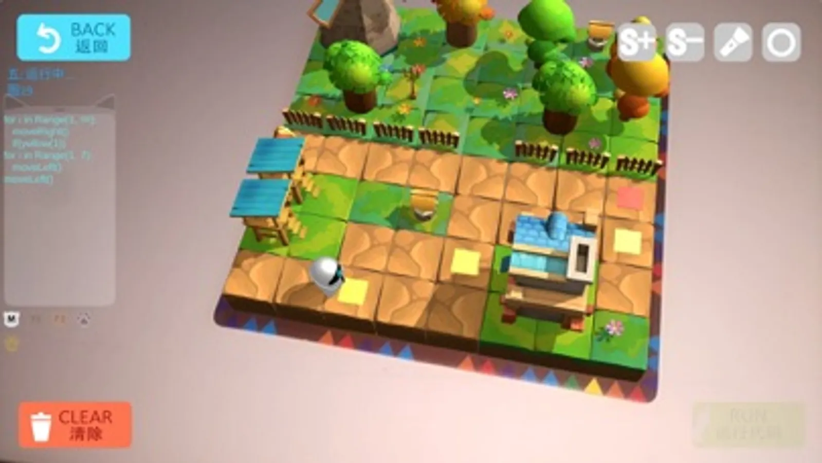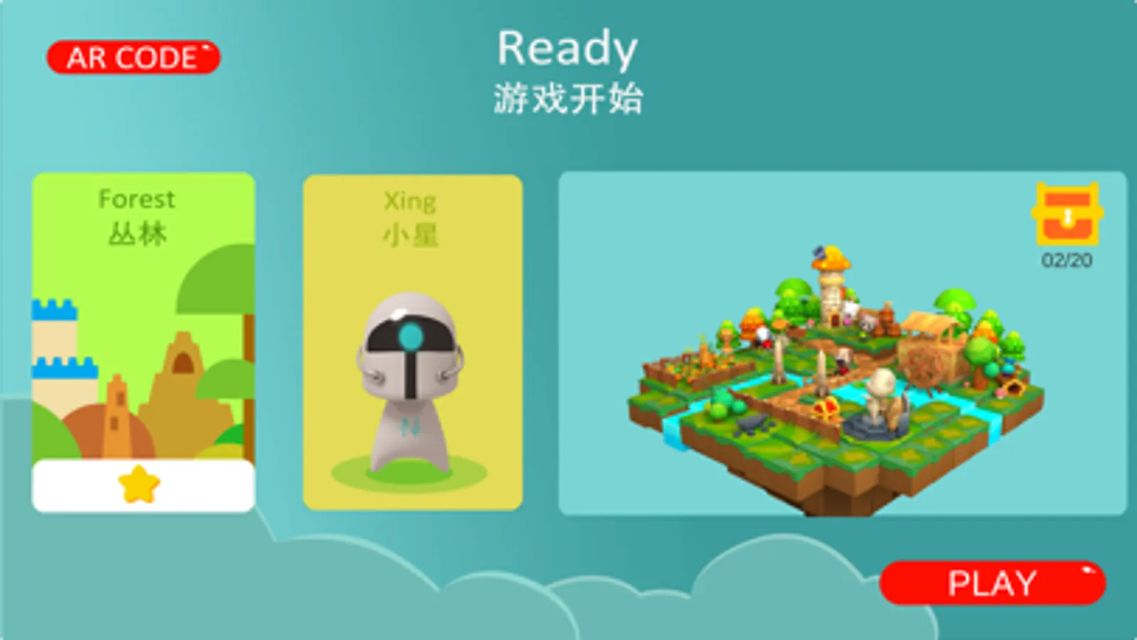 摆好代码后, 进入AR场景, 相机对准代码, 代码位置出现蓝色小方块表示该代码被相机识别, 等所有代码被识别后, 点击右下角确认,会转化所有有效代码(并翻译为python代码显示在左边代码框里), 然后识别地图卡片, 会出现3D模型和之前选择的人物, 点击运行开始移动, 人物是否能走到宝箱位置来验证代码是否正确。