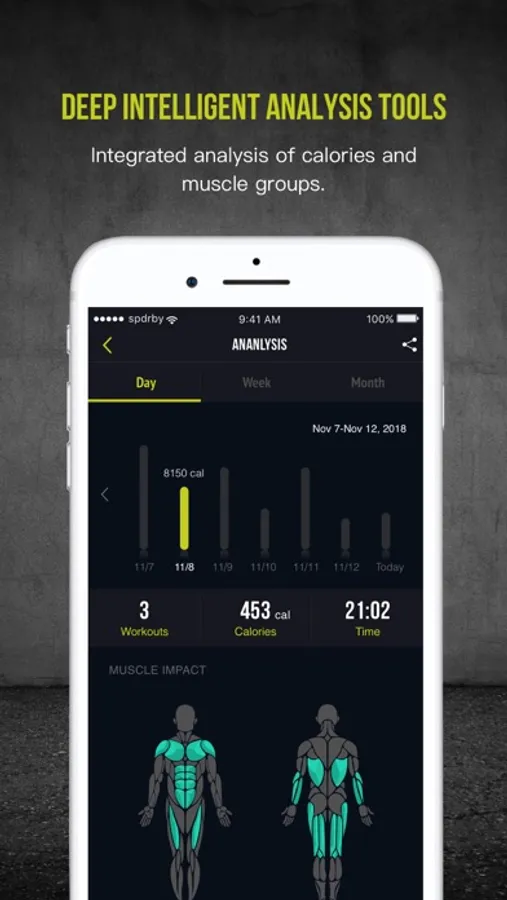 Daily, weekly, or monthly data analysis keeps statistics on calories burned and muscle groups challenged in order to examine your exercise progress.