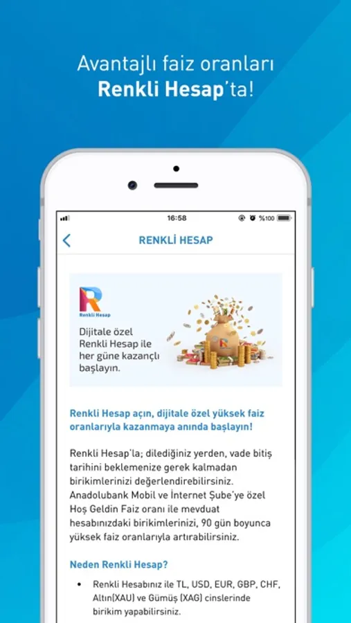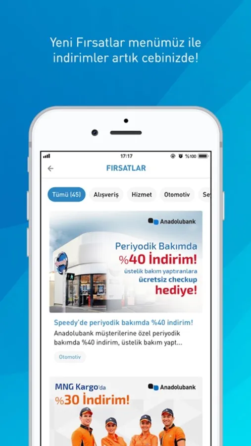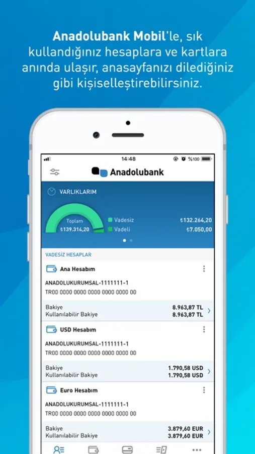 Anadolubank Mobil ile tüm müşterilerimiz para transferlerinden fatura ödemelerine, döviz alış satış işlemlerinden kredi ödemelerine kadar her türlü finansal işlemlerini hızlı ve kolay bir şekilde gerçekleştirebilir.