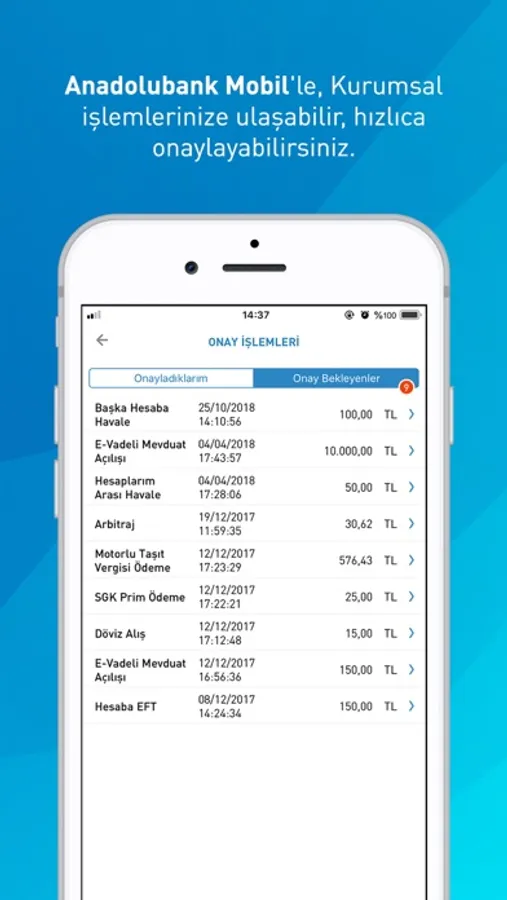 Buna ek olarak; Anadolubank Mobil, kurumsal müşterilerimize yetki ve onay tanımları içinde kendilerine düşen kurumsal işlemleri görüntüleyebilme ve onay verebilme imkanı sağlar.