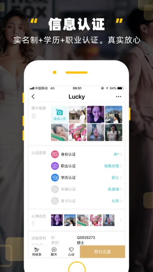 为打造真诚、真实、善良的交友环境,平台实行严格的信息审核制度,拥有学历、职业、资产、形象视频认证等认证系统,杜绝虚假信息、广告骚扰和不良用户的存在。