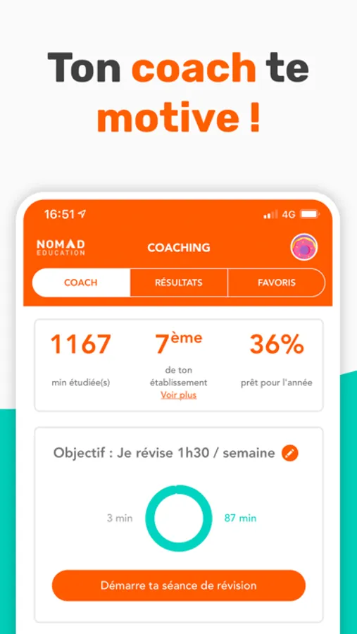 + Ton espace coaching pour te dépasser et gagner 3 points de moyenne (statistiques de progression, moyenne générale, objectif de révision...)