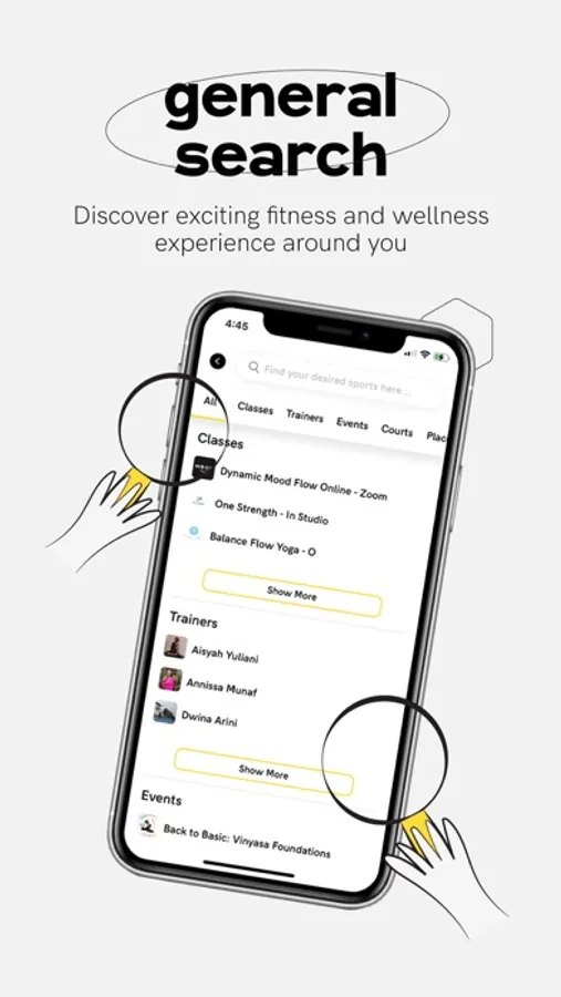 Choose Trainers, Classes, Courts, Places, Events, or Professional. Easily type it in search bar.