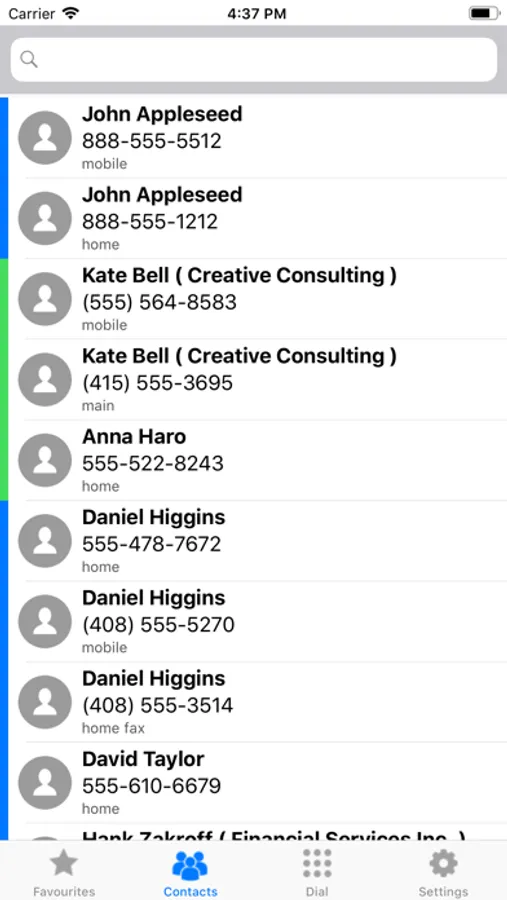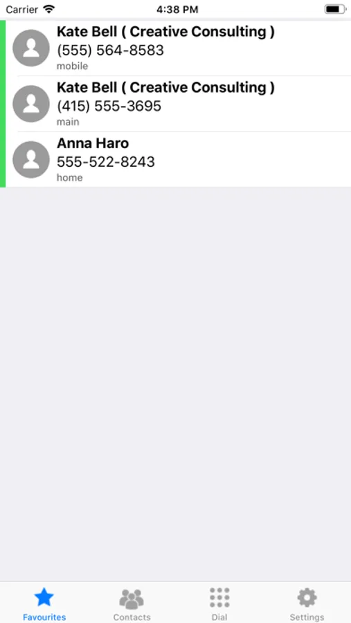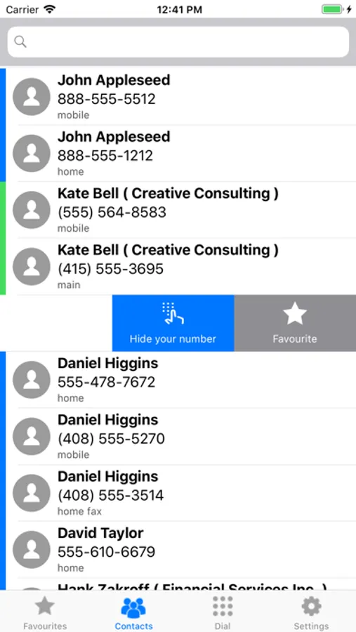Store your favourites easily from your contacts and keep track of how to call them. The blue marker in front of the name indicates that you will keep your phone number private when making the call. The green marker indicates that the person you are calling can see it is you.
