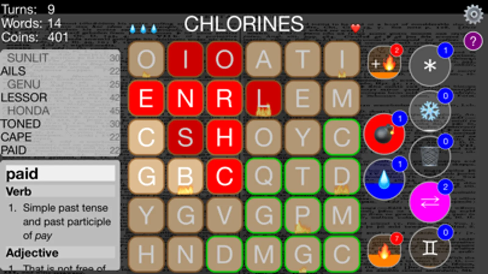 Wordish combines the fun of word searches, the dynamics of jewel matching games, and the rising tensions of good fiction. Make the longest word you can, then watch those letters disappear and new ones drop in from above. But the board's on fire so sometimes you need to give up a great word to clear out some flames instead. And did some of that fire just spread from one letter to its neighbors? Yikes!