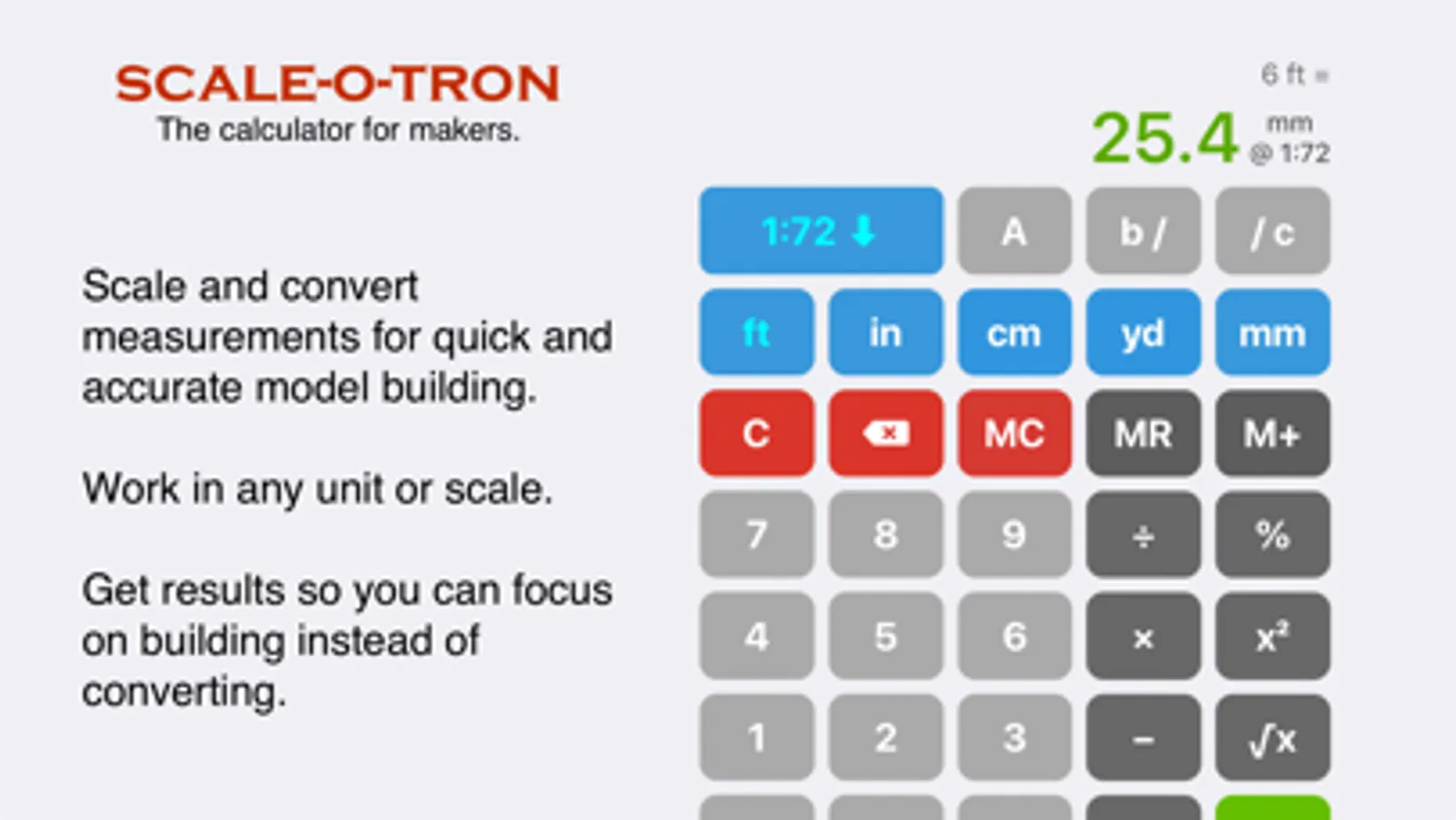 Scale-o-Tron features a large database of preprogrammed scales, measurement units and conversions so that you can work in the scale and system that’s best for your model. The calculator can also be easily customized to accommodate your workflow. Also, there are no ads or tracking.