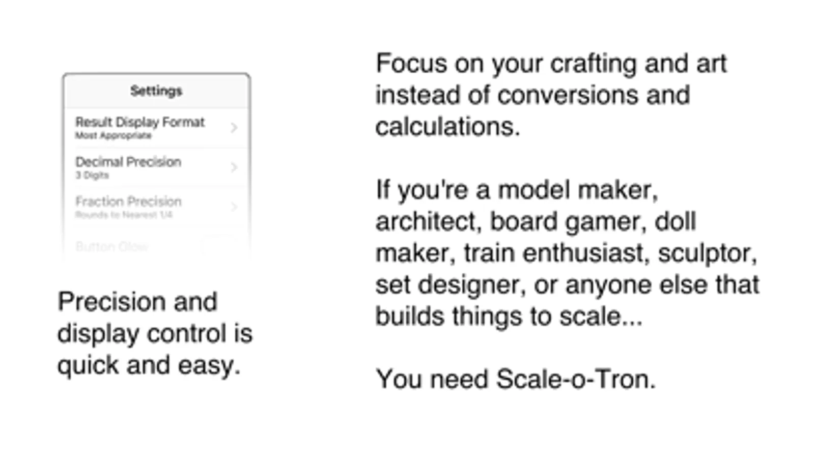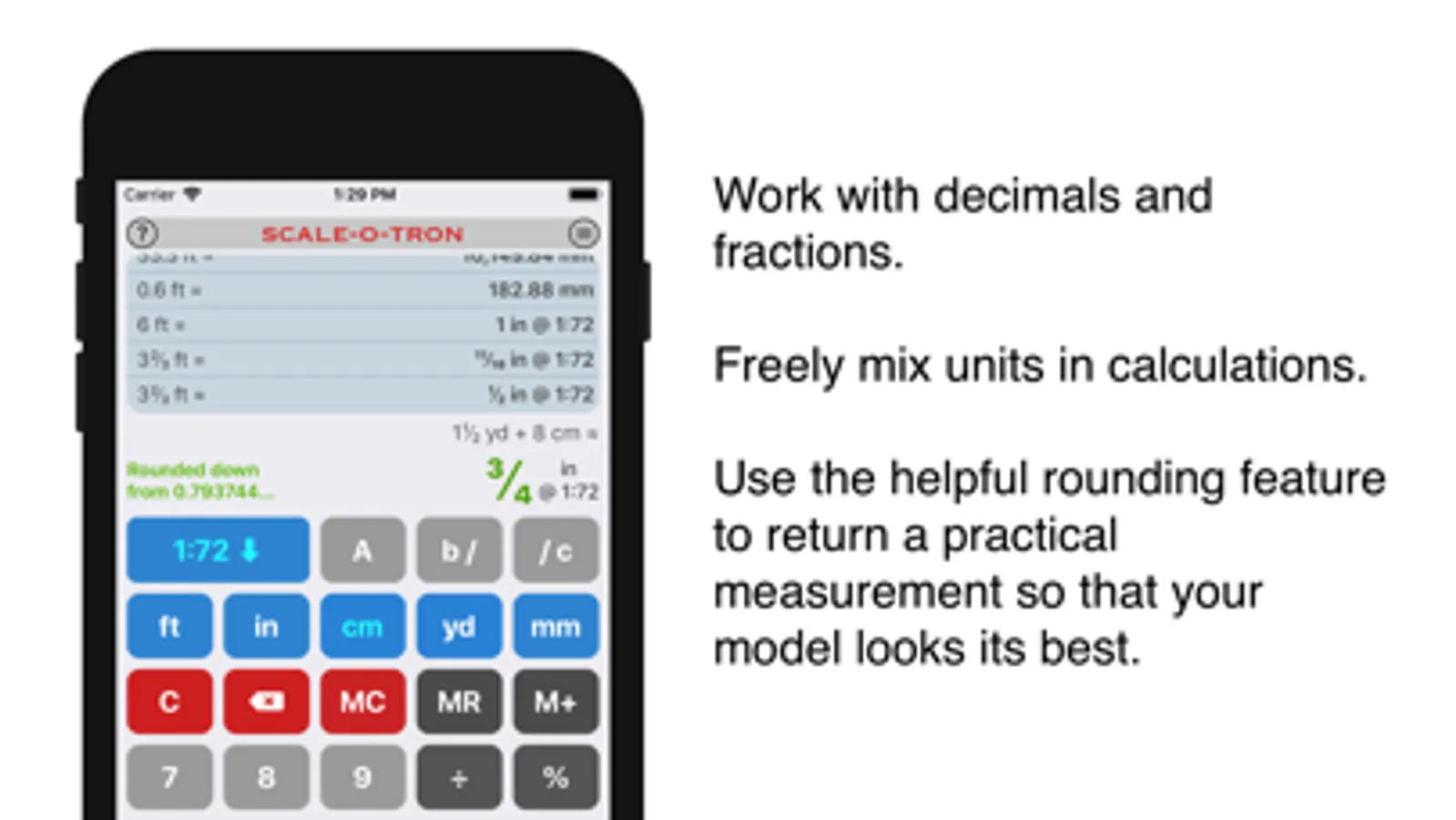 Build models and scaled objects quicker and with more accuracy using Scale-o-Tron. Model builders, architects, board gamers, doll makers, train enthusiasts, sculptors, set designers, and anyone else that builds things to scale can focus on their craft and art rather than spending time on conversions and calculations.