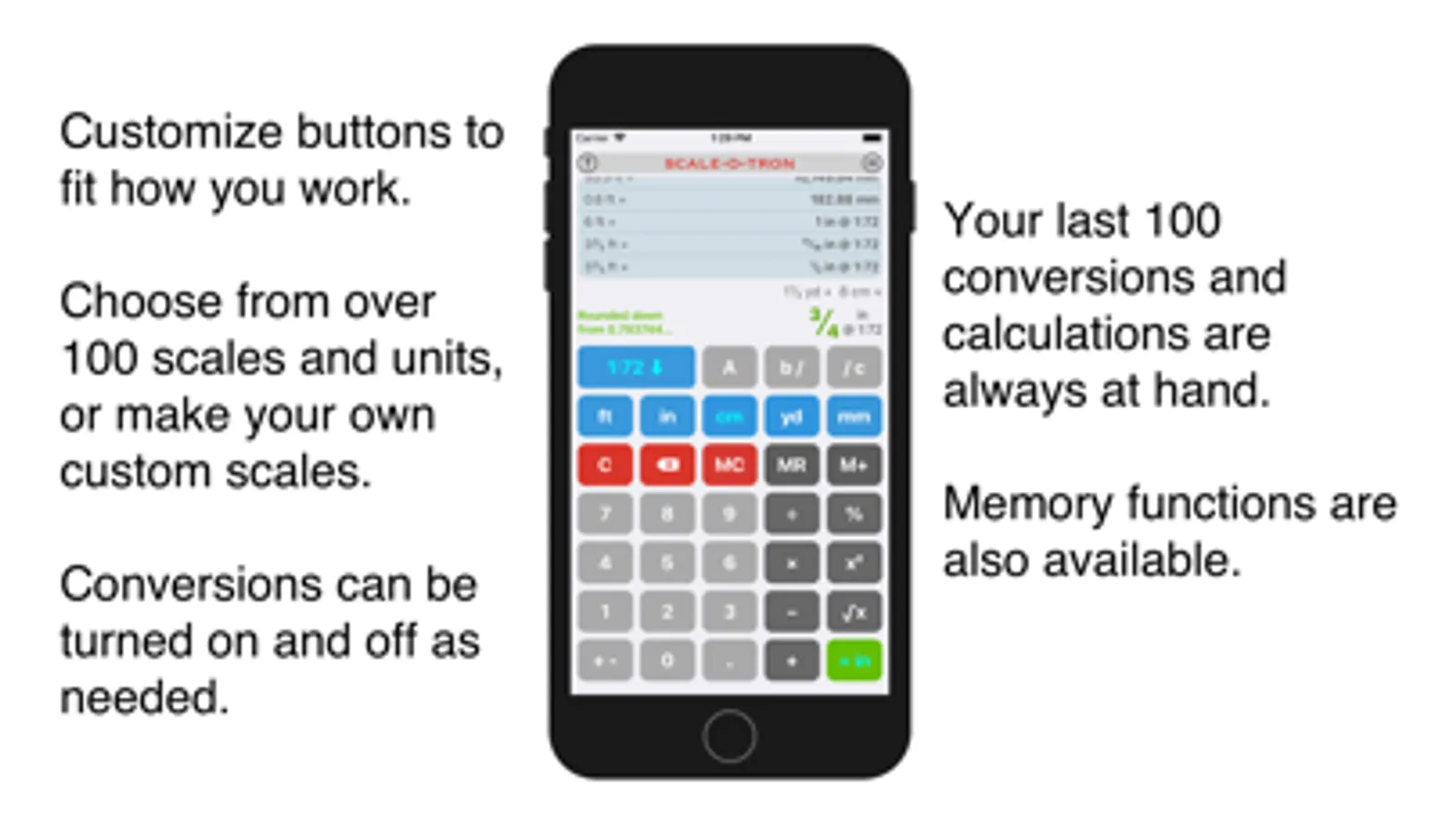 • Scaling and unit conversions can be switched on and off easily. Use Scale-o-Tron like a standard calculator, if you wish.