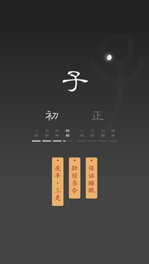 【子时】夜里11点到凌晨1点,是一天中离太阳最远的时段。又名午夜、子夜、夜分、宵分、未旦、未央等。古时候以子正初刻(00:00)为一日之开始,夜子初四刻(24:00)为一日之终结。