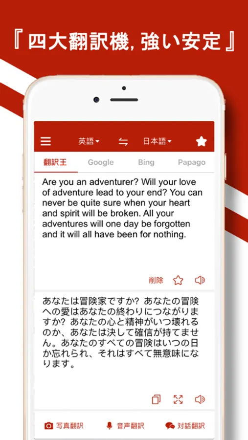 - 写真翻訳、音声翻訳、会話翻訳をサポートします。