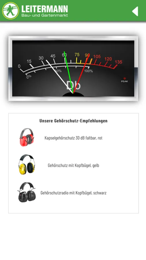 Mit dieser Funktion lässt sich der Dezibelmesswert bestimmen. Desweiteren werden Gehörschutz-Empfehlungen angezeigt.