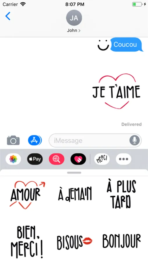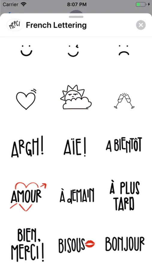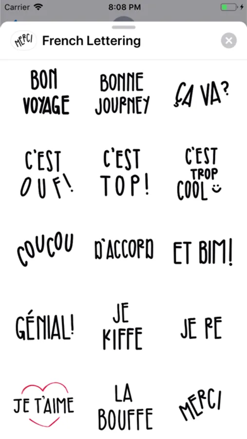 Tap on the "Merci" French Lettering iMessage app icon (just below the chatbox)