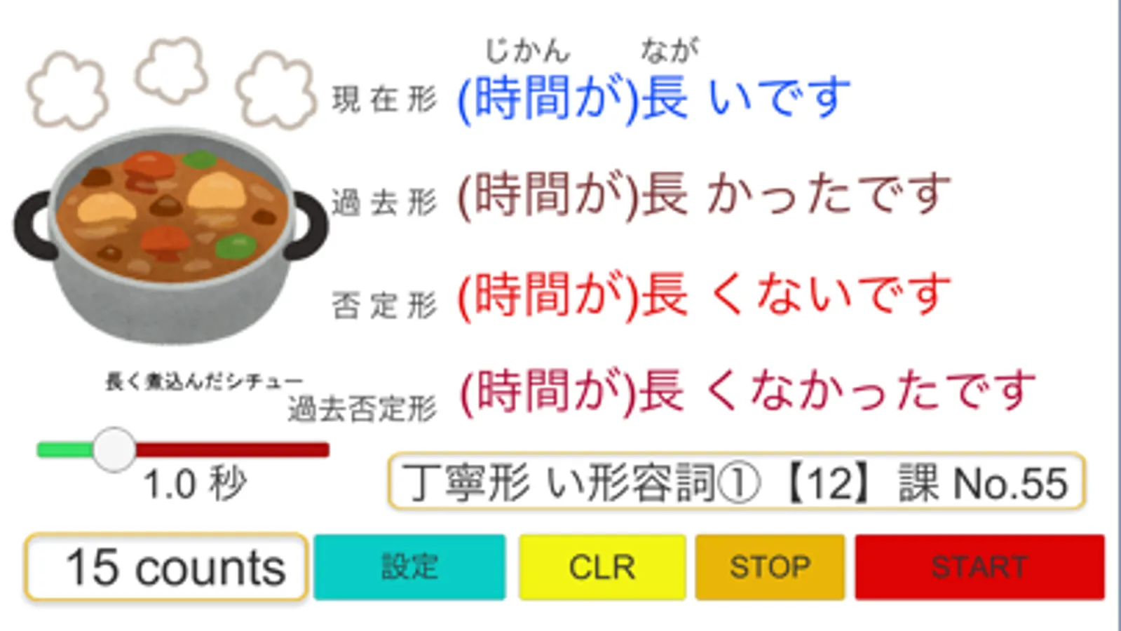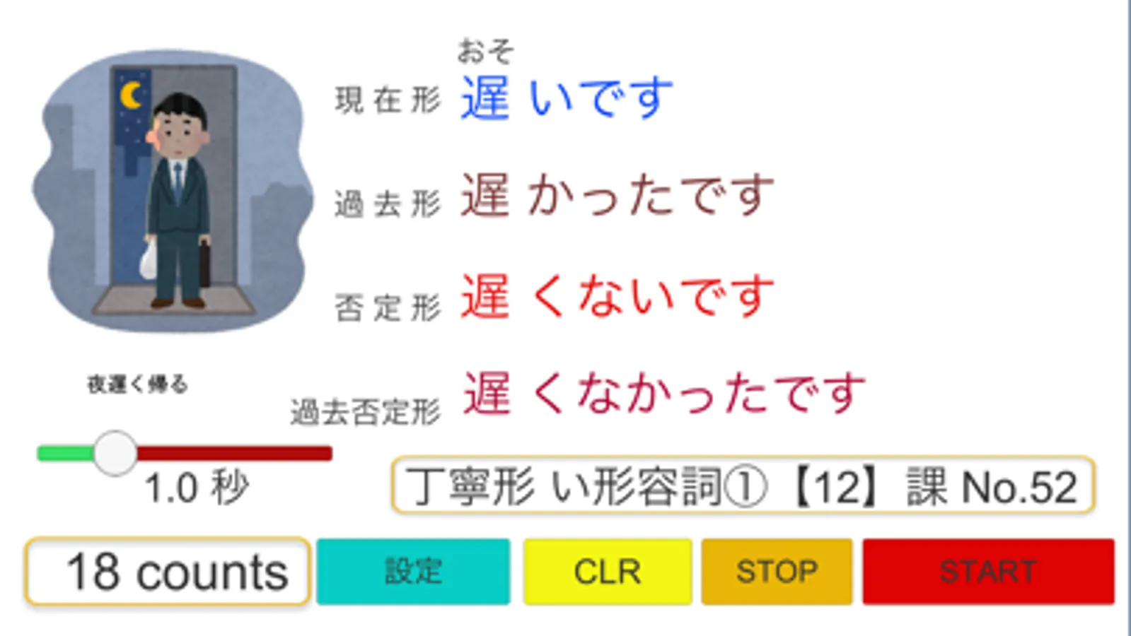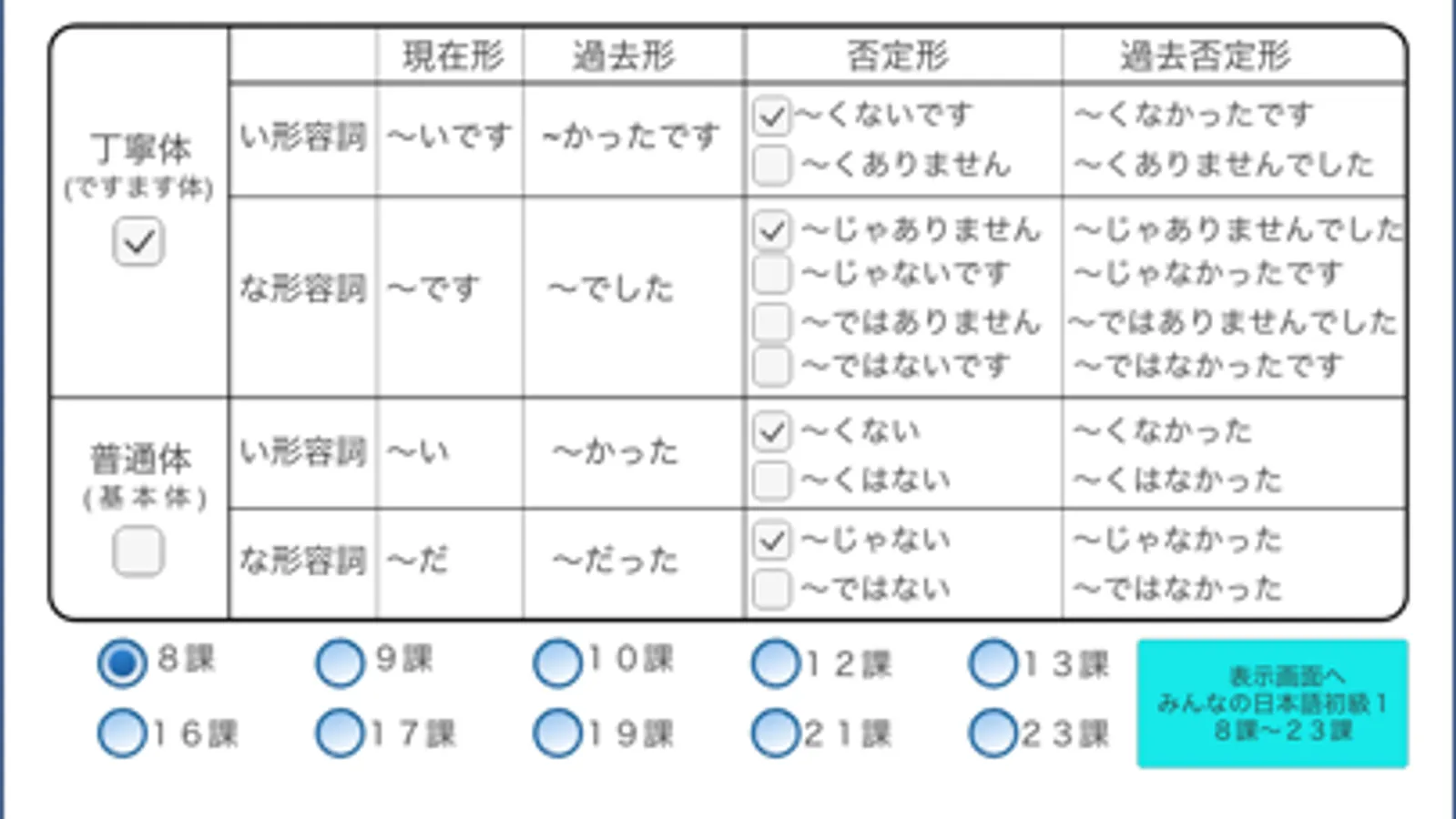 ・設定画面下部にあるラジオボタンで「表示する課」を選択してください。複数又はすべてを選択することが可能です。形容詞の新出がない課(1〜7課、11課、14課、15課、18課、20課、22課、24課、25課)はありません。