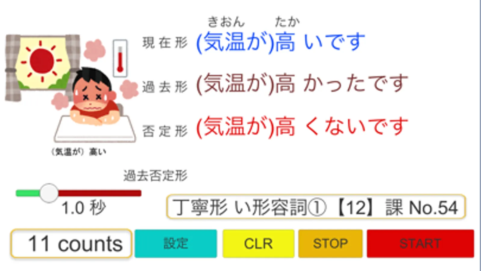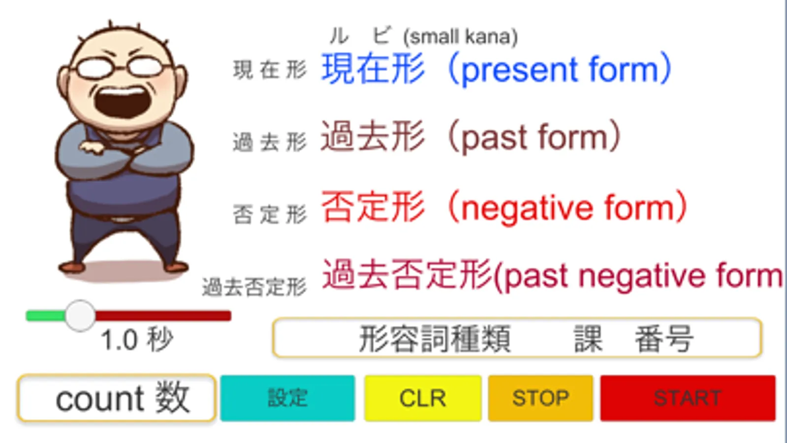 ・表示は上から「現在形」「過去形」「否定形」「過去否定形」の順で1秒毎で表示されます。