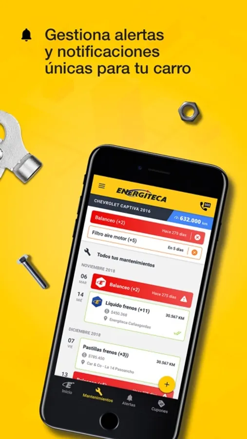 Nuestra app te permitirá llevar un detalle riguroso del mantenimiento de tu carro. Como cliente de Energiteca nuestro sistema, de forma automática, registrará los servicios a los que tu carro haya sido sometido y creará alertas por tiempo y kilometraje para nuevos servicios de mantenimiento y reposición de partes. A esta opción también podrás acceder de forma manual registrando cualquier mantenimiento que le hayas realizado a tu carro en cualquier otro taller.