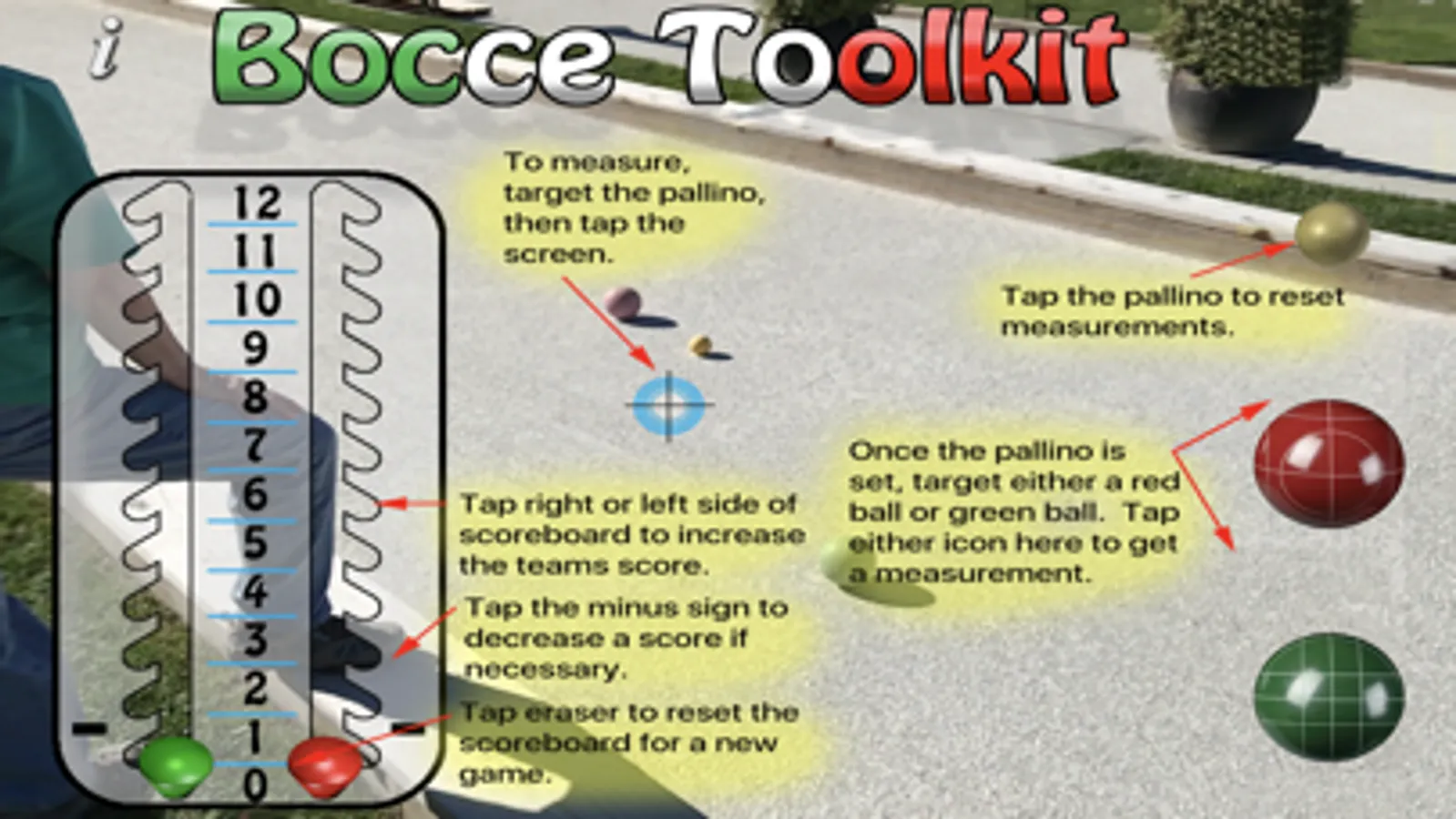 In addition you can use the Bocce Toolkit to keep score by moving markers up the screen to show the number of points that each team has.