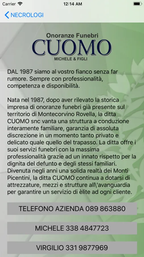 Consulta in tempo reale la lista di tutti i necrologi, trigesimi ed anniversari. Ricevi una notifica in tempo reale quando viene caricato un nuovo necrologio. Per ciascun defunto è inoltre possibile lasciare un messaggio di cordoglio per i familiari dei defunto. E' inoltre possibile contattare l'azienda direttamente dalla scheda contatti.