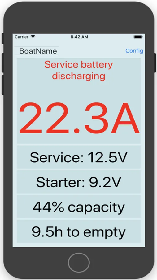 The NASA Battery Viewer displays the battery monitor information in a clear and simple way. The app allows you to configure which fields are displayed and where, allowing you to choose the most important field as the primary field. The charging/discharging display field will appear in red when discharging.