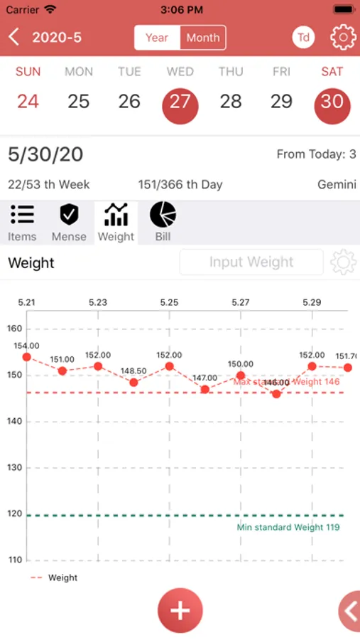 7. Weight record, standard weight calculation, and chart showing weight curve and standard weight