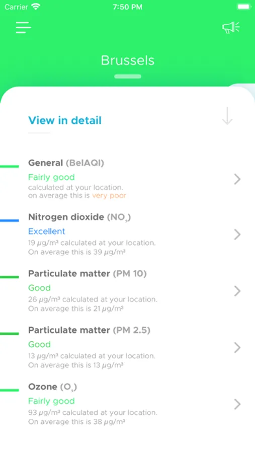 How good or bad the current air quality is depends on the concentrations of different substances in the air. The BelAQI air quality index is used to assess the air quality. It gives the air quality a rating from "very good" to "horrible". To calculate the BelAQI, the concentrations of various substances (nitrogen dioxide, particulate matter and ozone) are taken into account. For these substances, an individual assessment is made based on the short-term health effects. The worst assessed determines the overall BelAQI.