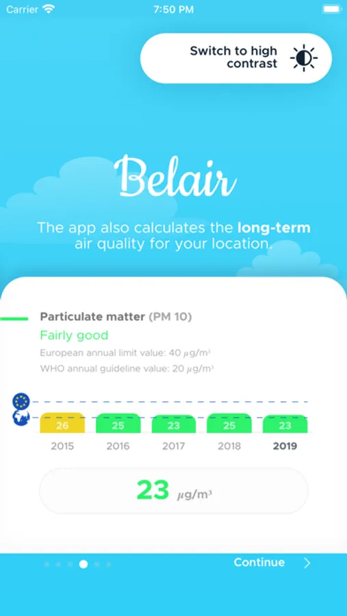 The BelAIR app not only gives an idea of the day-to-day (or sometimes even hour-to-hour) variation in air quality at a location at the moment, but also gives an idea of the air quality in the long term. The annual average concentrations for a location are compared with the European limit values and the World Health Organisation's health advisory values. This gives an idea of the long-term impact of air pollution on health.