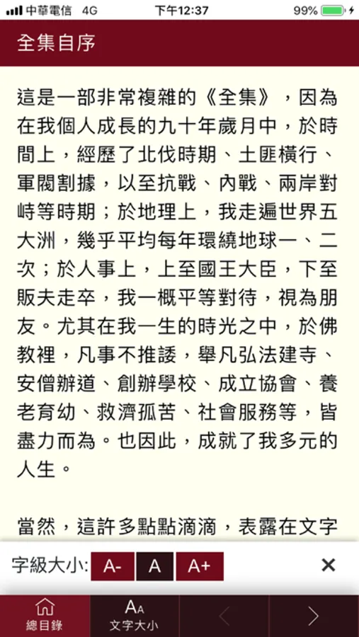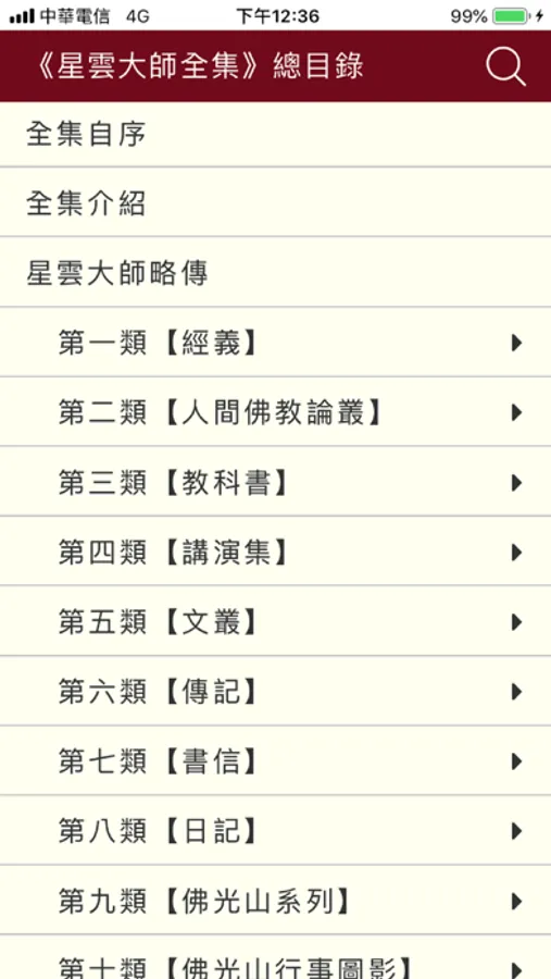 全書有12大類, 依序為: 經義、人間佛教論叢、教科書、講演集、文叢、傳記、書信、日記、佛光山系列、佛光山行事圖影、書法、附錄等,期能兼備橫的廣度、縱的深度,裨益讀者完整詳盡閱讀,及便利學術研究人士更簡捷查閱。