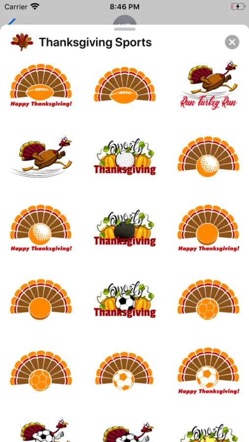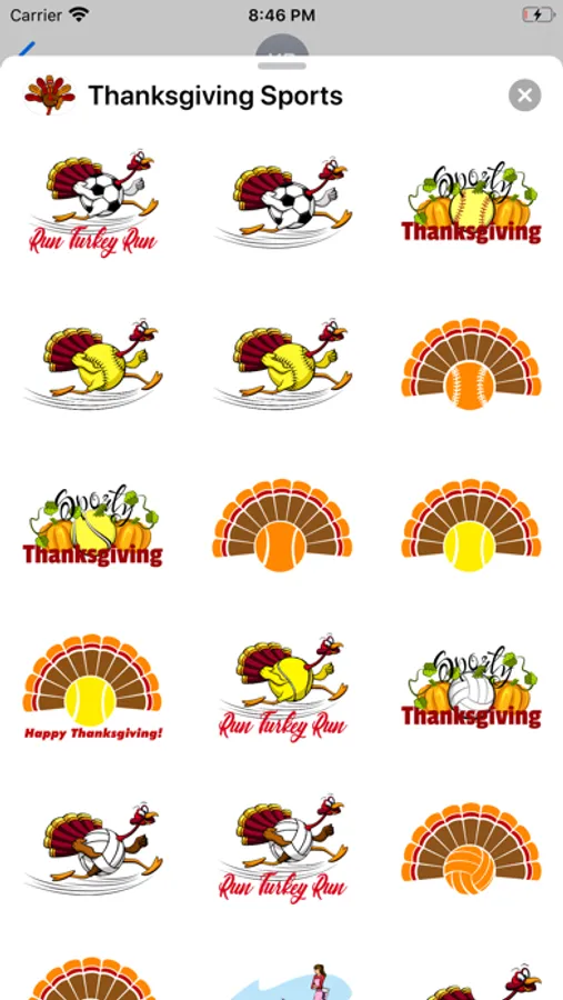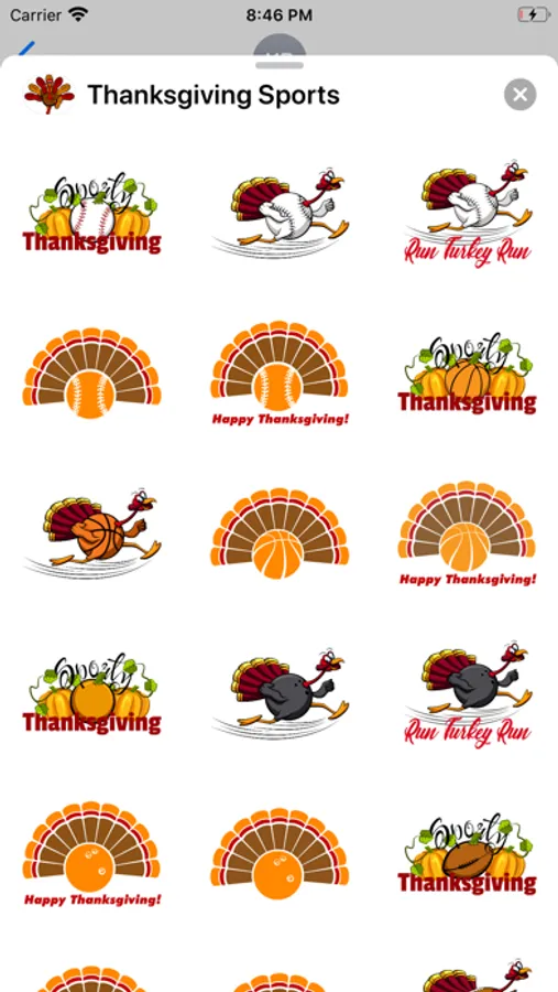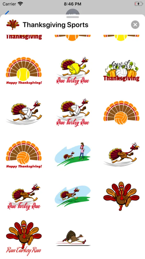 Thanksgiving stickers for runners and fans of baseball, basketball, bowling, football, hockey, golf, soccer, softball, tennis, and volleyball.