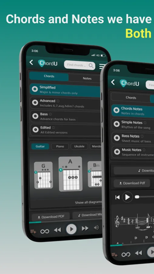Play any Instrument with the help of ChordU Notes. Notes are represented as sheet music with symbols & letters and support playing along with the song. Deeply analyze any song with the help of Simple & Music versions of notes.