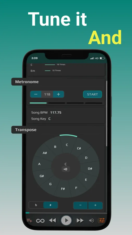 Just like a guitar capo, change the song key to any position and play chords in your preferred zone. The digital transposer lets you transpose to any key, both positively & negatively. Adjust the pitch according to your vocal range.
