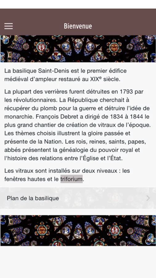 Cette application propose d’explorer les vitraux de la basilique : ceux réalisés par l’architecte et restaurateur François DEBRET, au XIXe siècle.