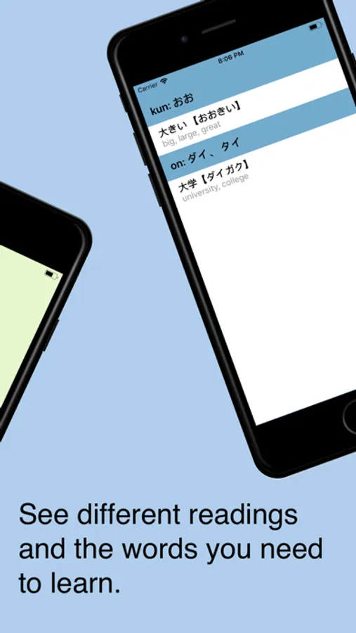 • Tap on a card to reveal the words you'll have to learn for that kanji, subdivided by On and Kun readings
