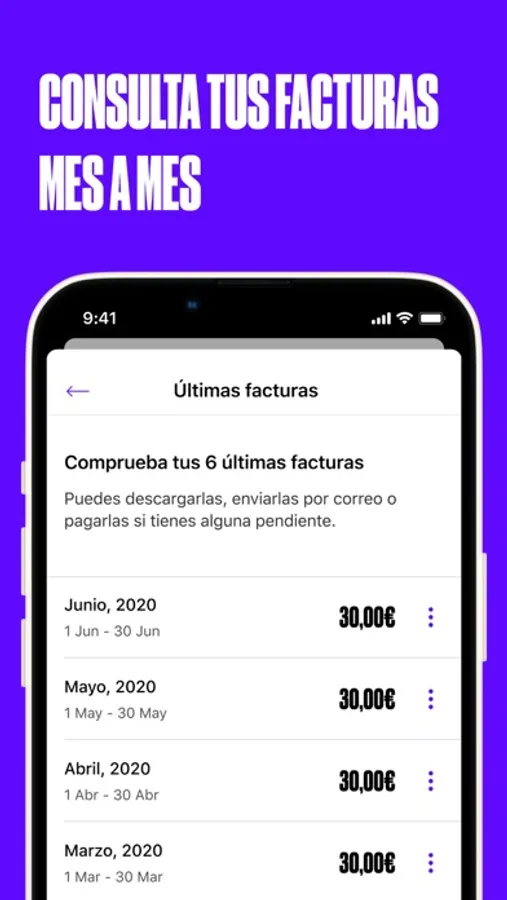 · Consulta tus facturas mes a mes: toda la información detallada de tus facturas, para que puedas revisar tu consumo y con opción a descargarlas en pdf.