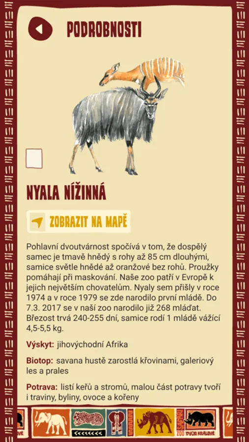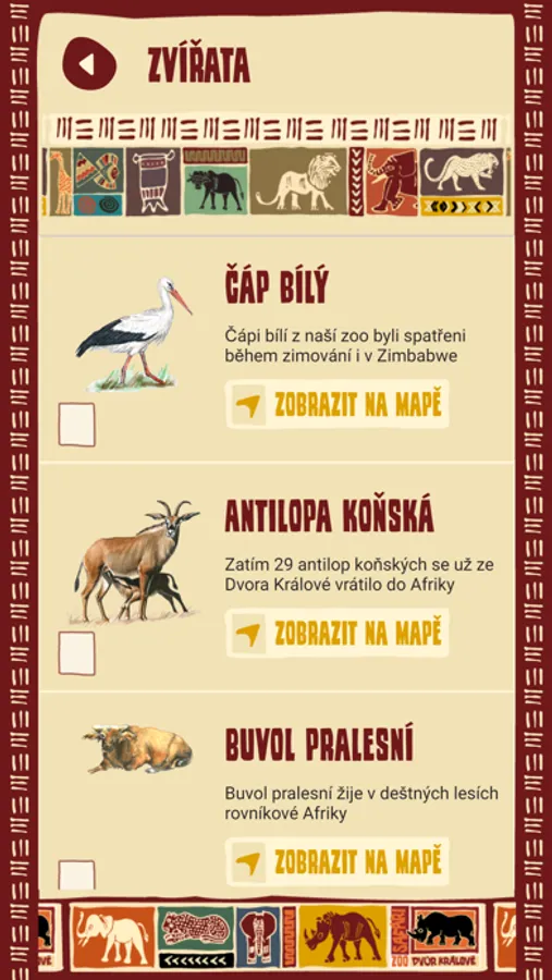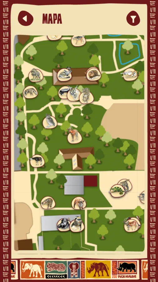 Interaktivní mapa pavilonů, občerstvení, a dalších důležitých míst v ZOO, lexikon zvířat včetně jejich pozice v ZOO.