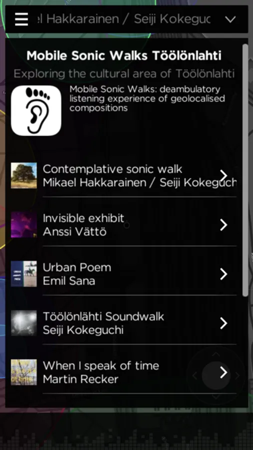 Mobile Sonic Walks proposes a deambulatory listening experience of musical compositions created for and diffused in a chosen site through geolocalisation by the students of the Centre for Music and Technology of the Sibelius Academy at the Uniarts Helsinki. Wandering around in the area you explore the sonic walks with your headphones and mobile phone.